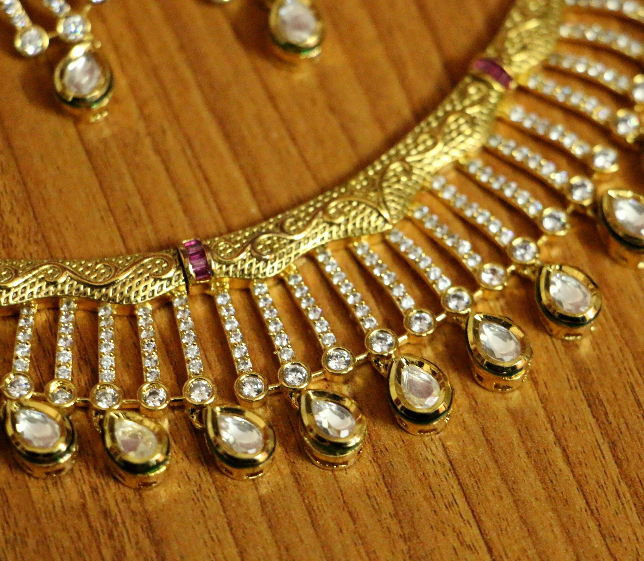 These beautiful necklaces set are handcrafted in brass alloy with imitation american diamond & kundan work of very fine quality. These necklace set are coated with 18kt gold polish which give them a unique look . An absolutely stunning piece to own and are very light in weight.