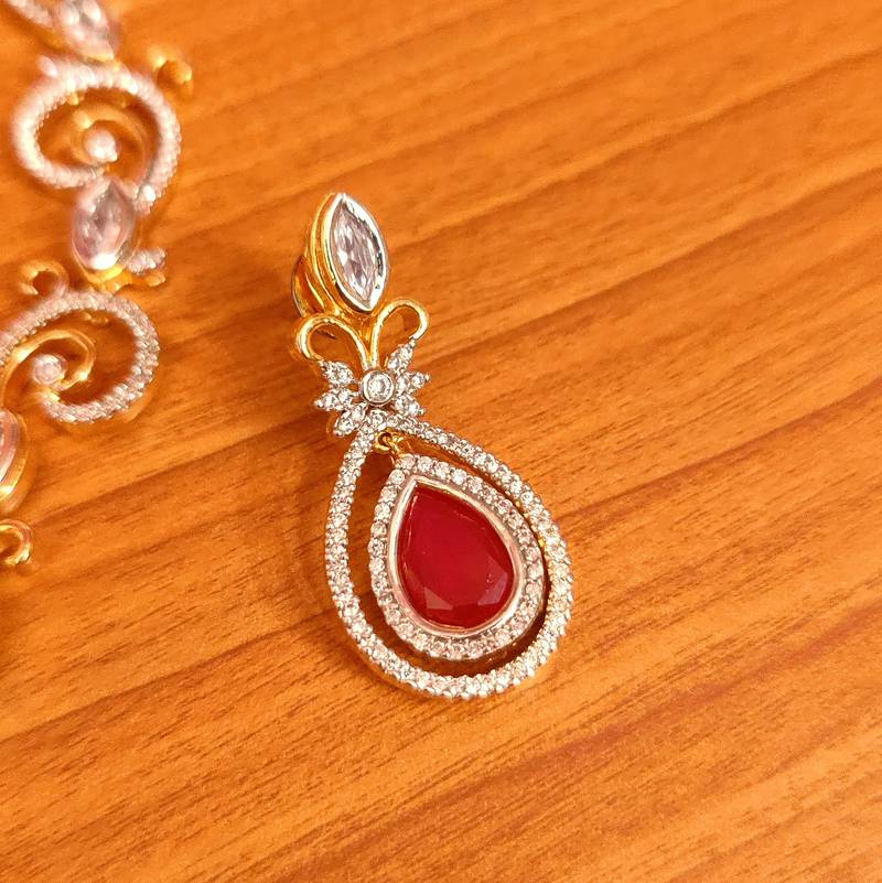 This beautiful necklace set is handcrafted in silver alloy with fine quality Ameriacn diamonds,Ruby and semi precious stone of zircon.This necklace set is coated with 18 kt gold polish which give them a unique look . An absolutely stunning piece to own and are very light in weight.