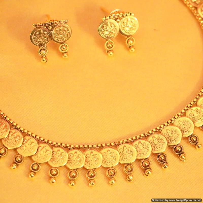This beautiful necklace set is handcrafted in copper alloy with ginni pattern coins of very fine quality and imitation pearls . This necklace set is coated with 18 kt gold polish which give them a unique look . An absolutely stunning piece to own and are very light in weight.Â
