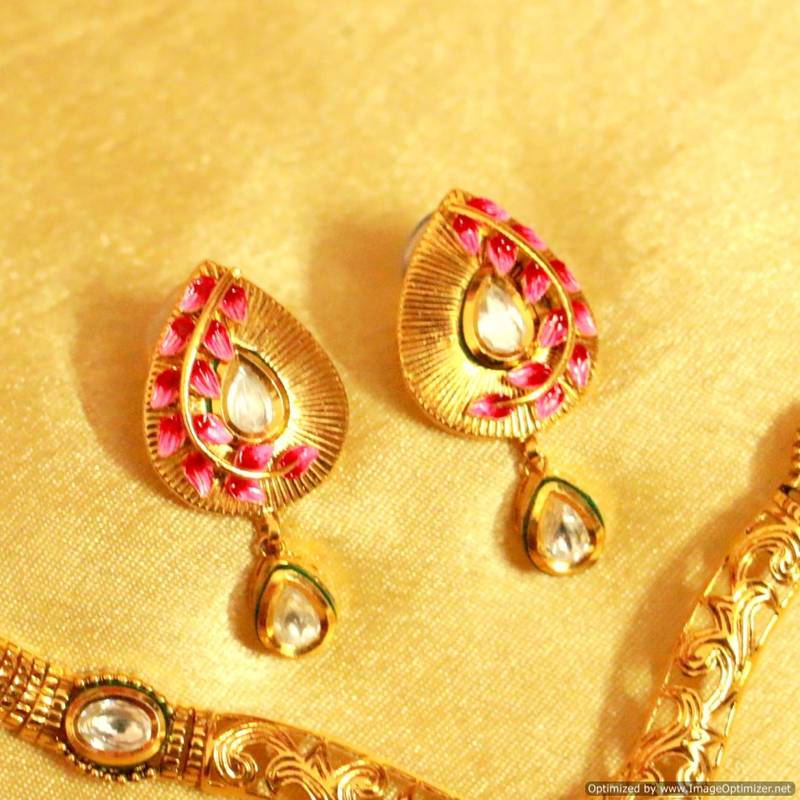 This beautiful necklace set is handcrafted in brass alloy with imitation kundan with meenakari work of very fine quality . This necklace set is coated with 18 kt gold polish which give them a unique look . An absolutely stunning piece to own and are very light in weight.